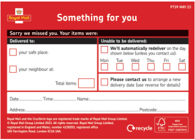 If no one was home when Royal Mail tried to deliver, they'll leave a red 'something for you' card. The card explains why they couldn't deliver and tells you how to arrange a Redelivery or pick up your item. They may attempt delivery to one of your neighbours or leave in a safe place. Please contact our customer care team, if you have any problems arranging re-delivery.